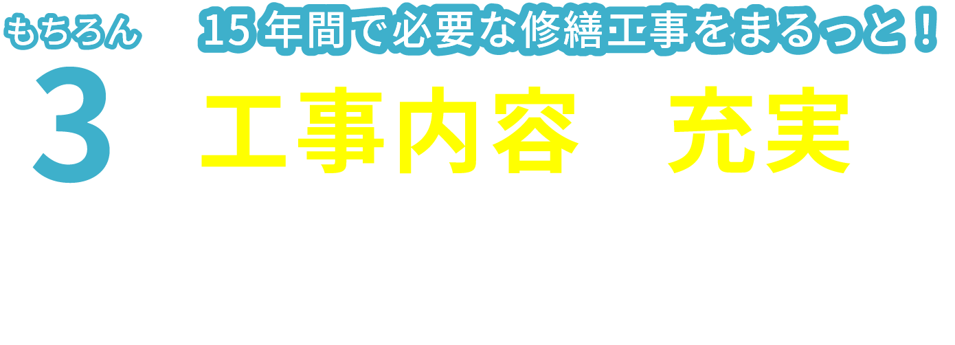 工事後の単発保証だけでなく、15年間の計画全体を通して建物を維持していく前提で設計されています。そのため、単発工事の保証とは異なり、長期的な視点での安心感を提供できる点が特長です。